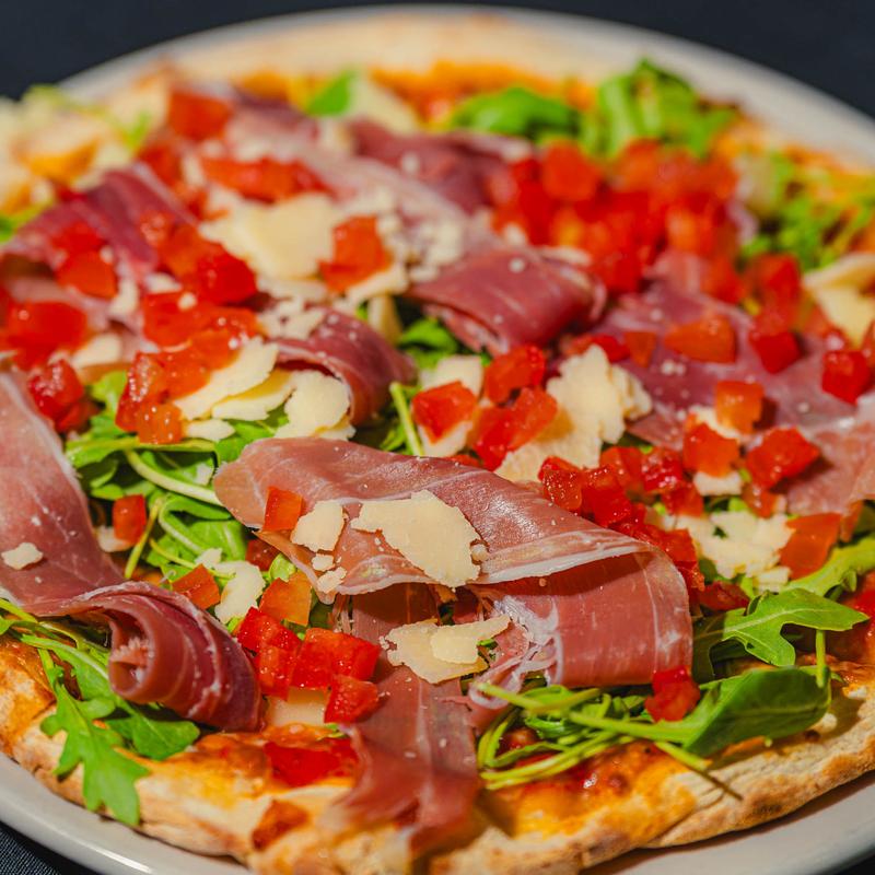 Tomato sauce, mozzarella, arugula, tomatoes, prosciutto, and shaved parmigiano.