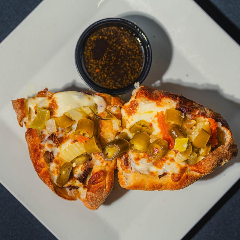 Sausage, caramelized onions, and peppers with melted provolone cheese.
