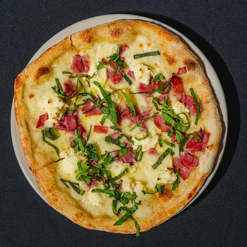 Mozzarella, mushrooms, truffle oil, prosciutto, and shaved parmigiano.