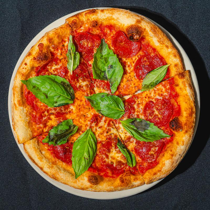 Tomato sauce, mozzarella, dry sausage, and shaved parmigiano.