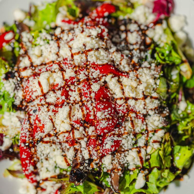 Spring mix, portobella mushrooms, roasted red peppers, goat cheese, EVOO, and balsamic vinegar.